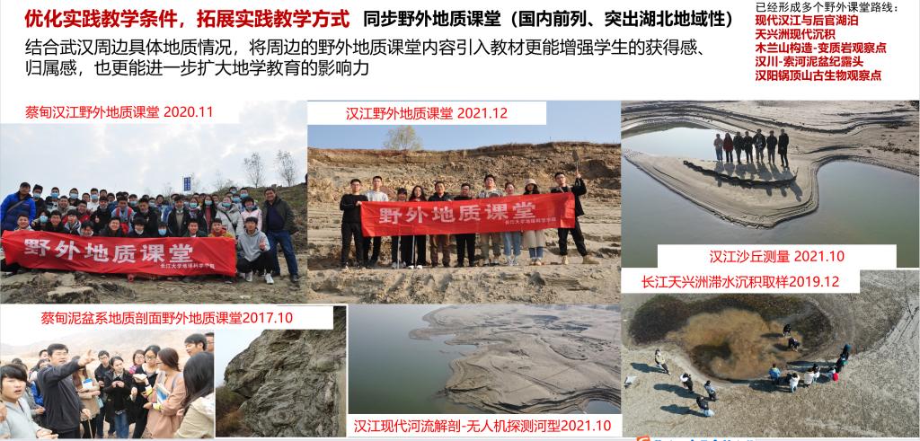 在蔡甸及其周边,如知音湖、汉江江滩、九真山、汉川采石场、汉阳锅顶山为观察点,开展科普基地扩展点建设。映射到现代湖泊、河流沉积,节理、断层和褶皱构造,同时还有古生物化石等地质学相关的地质现象,且距科普基地较近,单个科普点能够满足半天到一天的科普服务要求。 具体科普点如下: (1)已建立4个岩石观察点(图39):以知音湖、锅顶山为考察对象,建立碳酸盐岩观察的实习点;以九真山和汉江江滩为研究对象建立了碎屑岩及其地层发育特征观察的实习点。能满足公众对岩石基本类型及特征的识别,使其学会了解岩石类型。 (2)已建成5沉积观察点(图40-图41):以知音湖为考察对象,建立现代湖泊的沉积环境、沉积特征、沉积类型及成因等方面的总体认识,作为公众湖泊观察点;以汉江江滩为研究对象建立与河流相关内容结合的河流观察点。满足公众对沉积环境、沉积结构和沉积相分析的认识,让公众了解沉积环境、沉积结构和沉积相的相关知识。 (3)已建成4构造观察点(图42):以九真山为考察对象,建立节理、断层的几何学、运动学和动力学的总体认识,作为节理、断层观察点;以汉川采石场为研究对象,建立与褶皱相关内容观察点。满足公众对节理、褶皱和断层的观察分析需要,使公众了解相关构造的类型。 (4)已建成2个古生物观察点(图39、图43):以锅顶山为考察对象,建立古生物种群、生活环境、演化时代及古生物研究意义的总体认识,形成古生物观察点。满足公众在野外能看到古生物化石的需要,让公众了解古生物化石判断与形成过程。 依托蔡甸周边已建立的观察点,已为本校学生提供相关的课间野外实践服务,并多次接待社会各界领导、专家参观、指导。同时,增加了社会服务及社会公益等方面影响力,丰富了武汉市爱好人员地质知识。蔡甸周边地质观察点是“中国地层标本长廊”服务范围的有效拓展。 以下为已开展的相关活动记录。 蔡甸周边实践科普观察点 蔡甸周边、长江及汉江实践科普观察点 蔡甸周边、长江及汉江实践科普观察点 蔡甸周边科普实践观察点 蔡甸周边科普实践观察点立碑