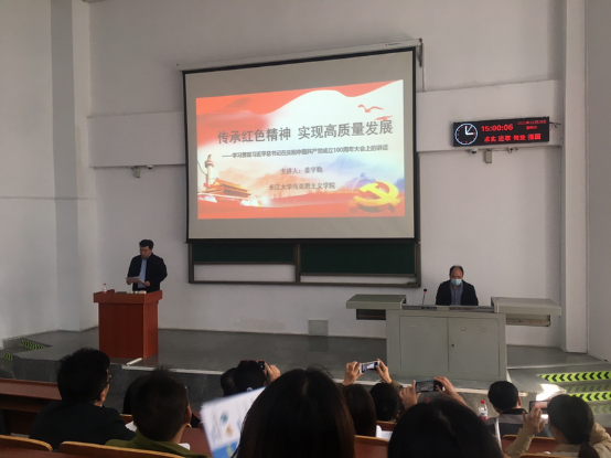 宣讲会上,姜教授从国际形势-百年未有之大变局、历史方位-新时代开新局、奋斗目标-中华民族伟大复兴战略全局、实现途径-贯彻新发展理念,实现高质量发展,推进科技自立自强和根本动力-传承红色精神五个方面对习近平总书记的七一讲话进行了全面剖析。姜教授讲到,世界看中国的眼光在变,世界对待中国的行动在变,中国是世界和平的建设者,是全球发展的贡献者。中国共产党实现中华民族伟大复兴的初心和使命不会改变,发展之路任重而道远,在经济建设、政治建设、文化建设、民生社会建设和生态文明建设方面,广大党员干部需弘扬伟大的建党精神,不忘初心,牢记使命。