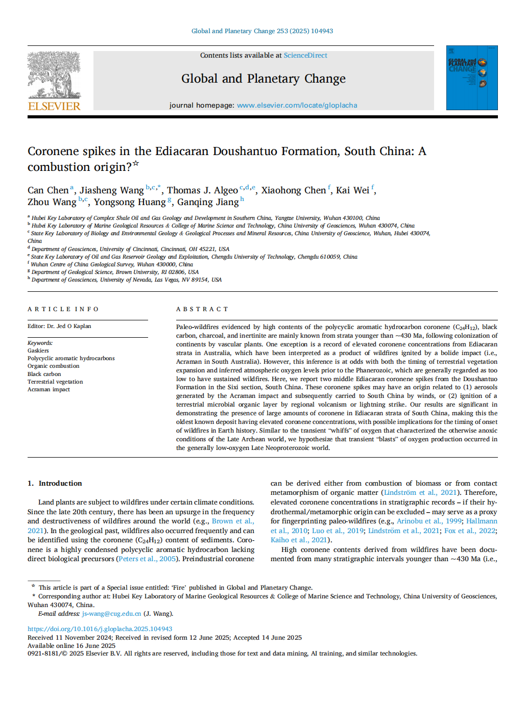 (通讯员 卢志远)地科学院特任教授陈粲在《Global and Planetary Change》上发表题为“Coronene spikes in the Ediacaran Doushantuo Formation, South China: A combustion origin?”的论文,澳门十大网投正规官网平台南方复杂页岩油气地质与开发湖北省重点实验室为论文第一署名单位,特任教授陈粲为第一作者。