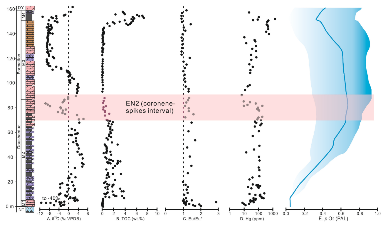 图1 华南泗溪剖面中-上陡山沱组碳同位素、化学蚀变指数 (CIA) 和晕苯浓度变化。蓝色区域代表低CIA值指示的寒冷期,该期可能对应于Gaskiers Glaciation冰期。晕苯/Al₂O₃峰值1和2显示为粉色区域。每个峰值对应 EN2 δ¹³C 值波动(红色虚线)。