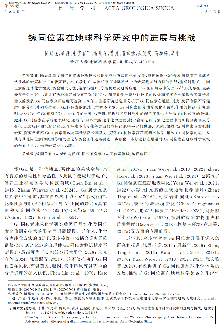 (通讯员 黄月)近日,澳门十大网投正规官网平台21级本科生(现在读大四)陈思钰在《地质学报》上发表了题为《镓同位素在地球科学研究中的进展与挑战》的论文(共17页)。全部作者均来自澳门十大网投正规官网平台师生,本科生陈思钰为论文第一作者,其导师朱光有教授为通讯作者。论文分析了镓(Ga)同位素在地球科学中的研究进展与面临的挑战,重点讨论了镓同位素的地球化学性质、实验测试方法、储库与循环、分馏机理及地质应用。