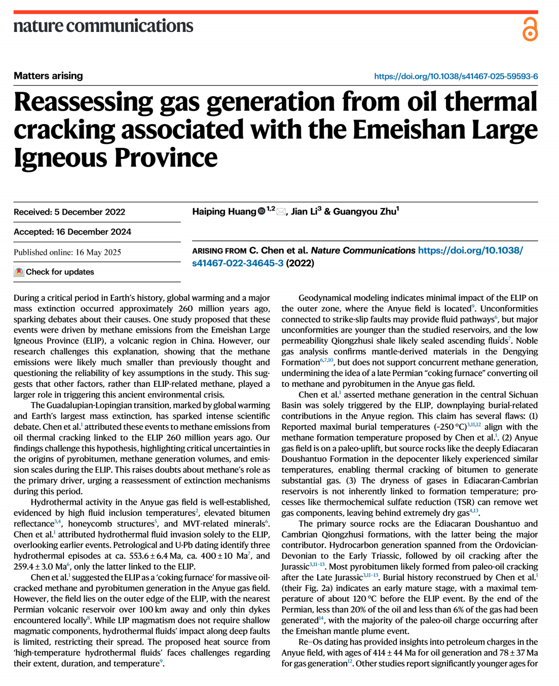 (通讯员 卢志远)近日,澳门十大网投正规官网平台黄海平教授等在国际顶级期刊《Nature Communications》上发表题为《Reassessing gas generation from oil thermal cracking associated with the Emeishan Large Igneous Province》的论文,对峨眉山大火成岩省(ELIP)诱发的原油裂解释放甲烷是否是二叠纪末全球气候剧变和生物大灭绝的主要原因提出了讨论,并对甲烷的生成与释放量进行了重新评估。