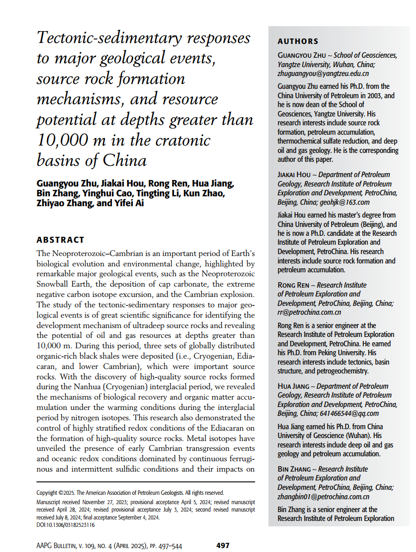 (通讯员 卢志远)澳门十大网投正规官网平台朱光有教授在石油地质学专业期刊《AAPG Bulletin》上发表了题为《Tectonic-sedimentary responses to major geological events, source rock formation mechanisms, and resource potential at depths greater than 10,000 m in the cratonic basins of China》的论文(共48页)。《AAPG Bulletin》是美国石油地质学会(American Association of Petroleum Geologists)旗下的一本国际性的地质学期刊,涵盖了石油地质学前沿领域的研究和发现。