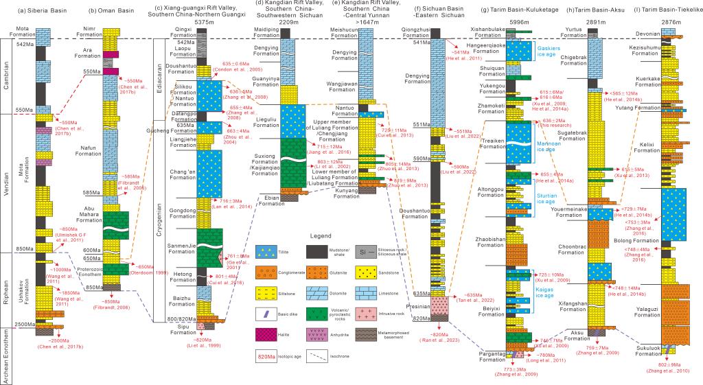 新元古代-寒武纪是地球演化的关键变革期,发生了一系列重大地质事件,最为显著的是超大陆裂解事件、新元古代“雪球”地球事件及新元古代-寒武纪大气-海洋氧化事件等,深刻影响了地球各圈层的演化进程,控制了盆地超深层南华系、埃迪卡拉系和寒武系黑色富含有机质烃源岩的形成。比如华南南华系大塘坡组、埃迪卡拉系陡山沱组、寒武系牛蹄塘组/筇竹寺组黑色页岩及塔里木盆地南华系特瑞艾肯组、埃迪卡拉系水泉组/苏盖特布拉克组、寒武系玉尔吐斯组/西大山组等黑色泥岩。