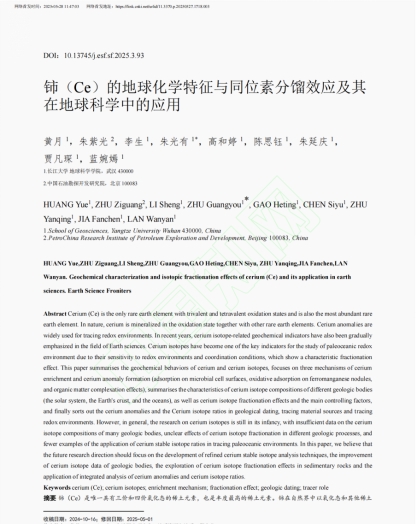 (通讯员 陈思钰)近日,澳门十大网投正规官网平台21级本科生(现在读大四)黄月在中文核心(EI)期刊《地学前缘》上发表了题为《铈(Ce)的地球化学特征与同位素分馏效应及其在地球科学中的应用》的论文(共24页)。本科生黄月为论文第一作者,其导师朱光有教授为通讯作者,该论文还有四位本科生作者。论文分析了铈(Ce)及其同位素的地球化学行为、富集机制、同位素分馏效应及控制因素;梳理了其在地质测年、示踪物质来源与氧化还原环境中的应用。