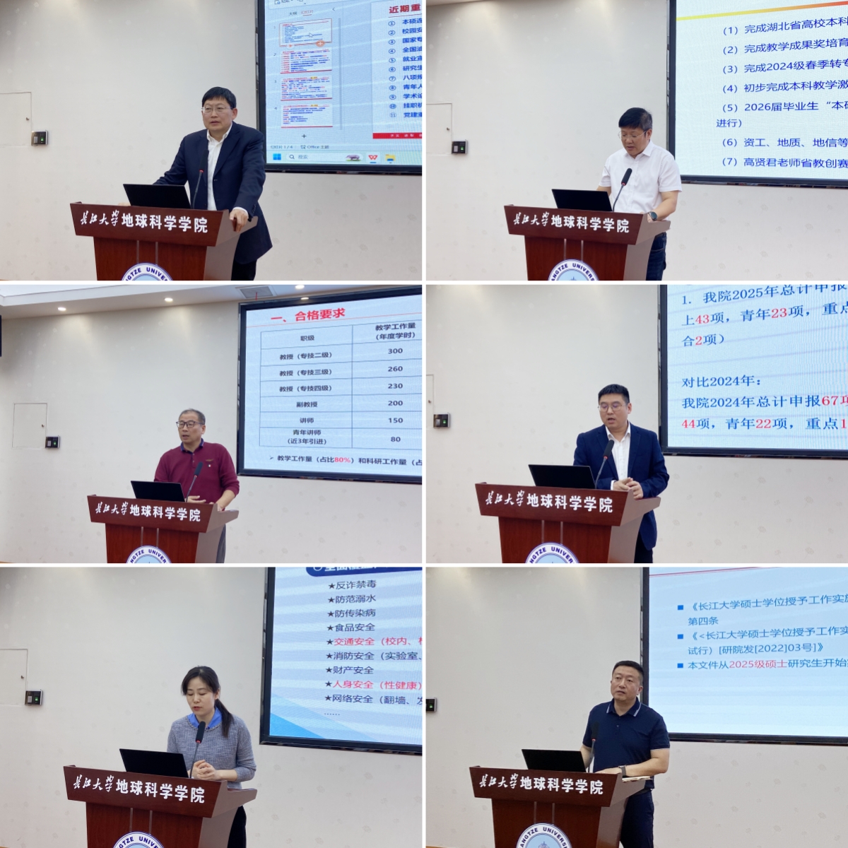 副院长胡忠贵通报了近期湖北省高校本科专业监测评估工作,教学成果奖培育项目申报,2024级春季转专业,本科教学激励制度建设,2026届毕业生“本硕博贯通培养拔尖创新人才计划”选拔工作,资工、地质、地信等专业实验班选拔及分流,省教创赛和省青教赛备赛等工作的完成情况和进展,对2024~2025学年第二学期期中教学检查相关工作做出了部署。