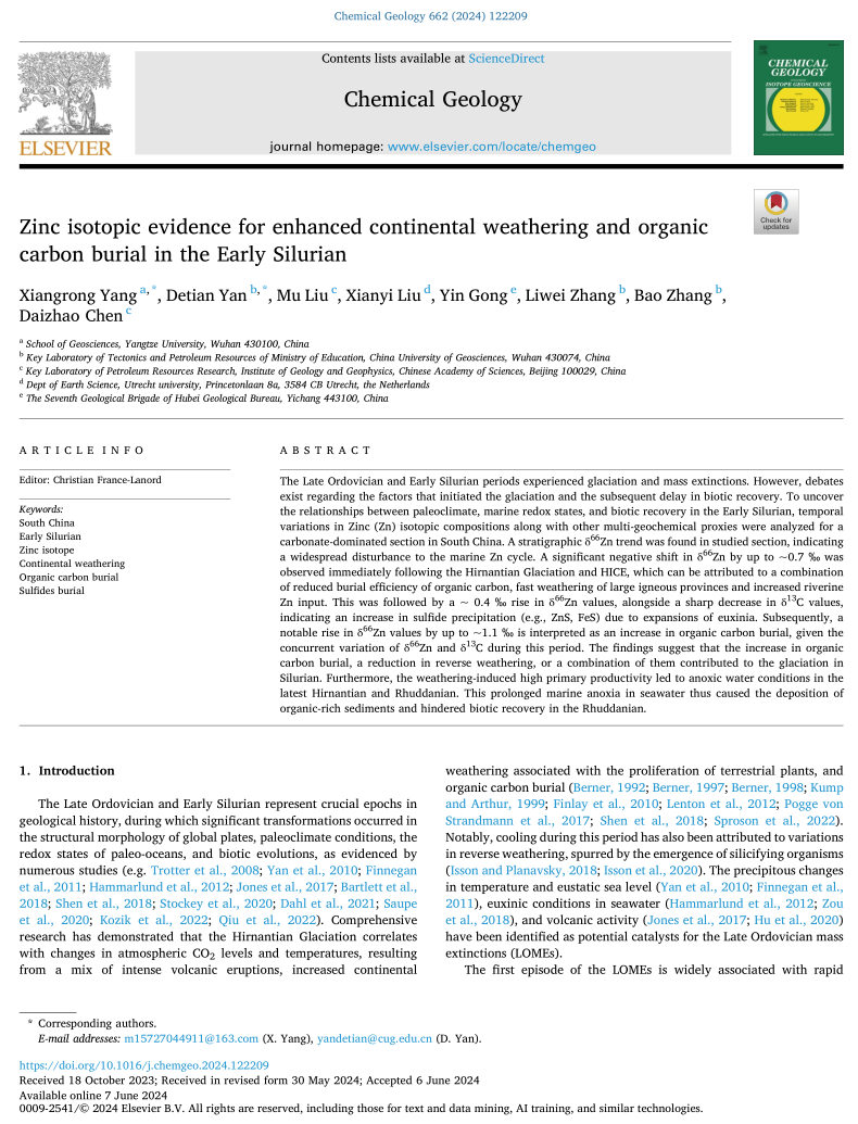 澳门十大网投正规官网平台地质系教师杨向荣在地学TOP期刊《Chemical Geology》上发表题为“Zinc isotopic evidence for enhanced continental weathering and organic carbon burial in the Early Silurian”的研究论文。
