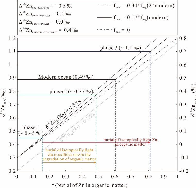 图3 乌科剖面晚奥陶世-早志留世古海洋锌(δ66Zncarb)同位素演化与有机碳埋藏关系模拟图