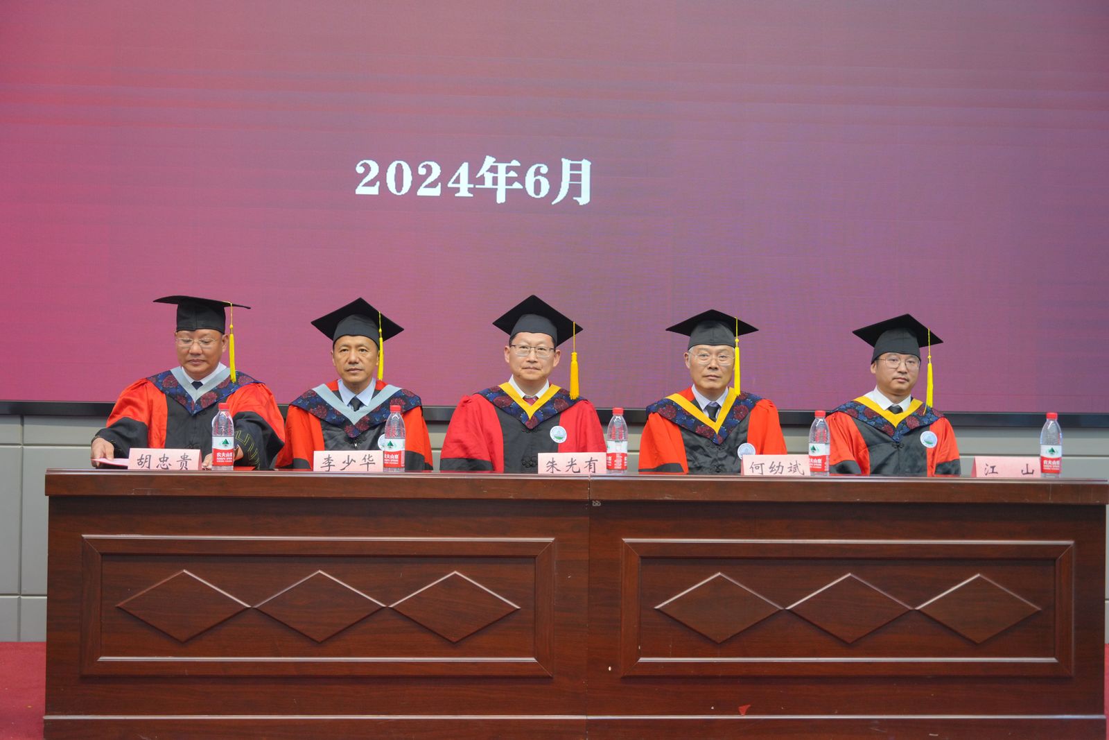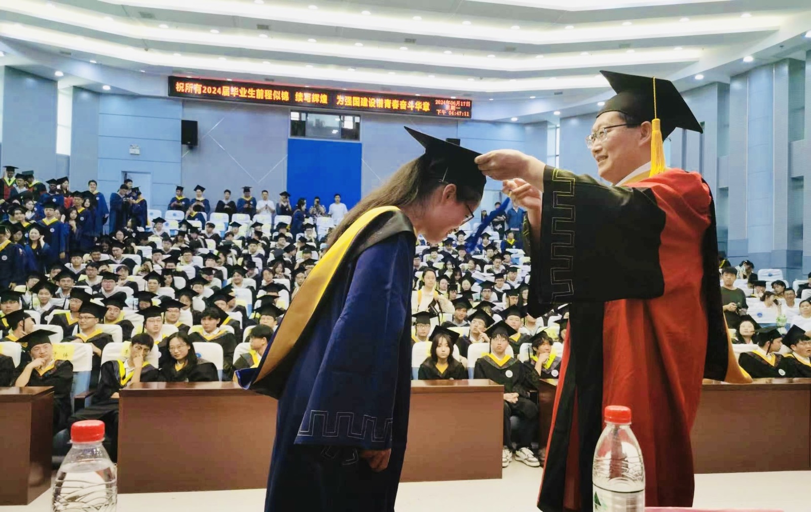 伴随着热烈的掌声,导师代表依次上台就坐。台下300多名毕业生身着学位服,神采奕奕,眼神中满载着对未来的憧憬。授予仪式正式开始,由胡忠贵副院长宣读学位授予文件,江山副院长为同学们正冠,朱光有院长为每位获得学位的同学颁发学位证书,拨穗并合影留念。毕业生以自豪和激动的心情接过学位证书。这薄薄的一纸证书,承载着同学们数年如一日的努力和坚持。整场仪式在庄重而温馨的氛围中圆满完成。