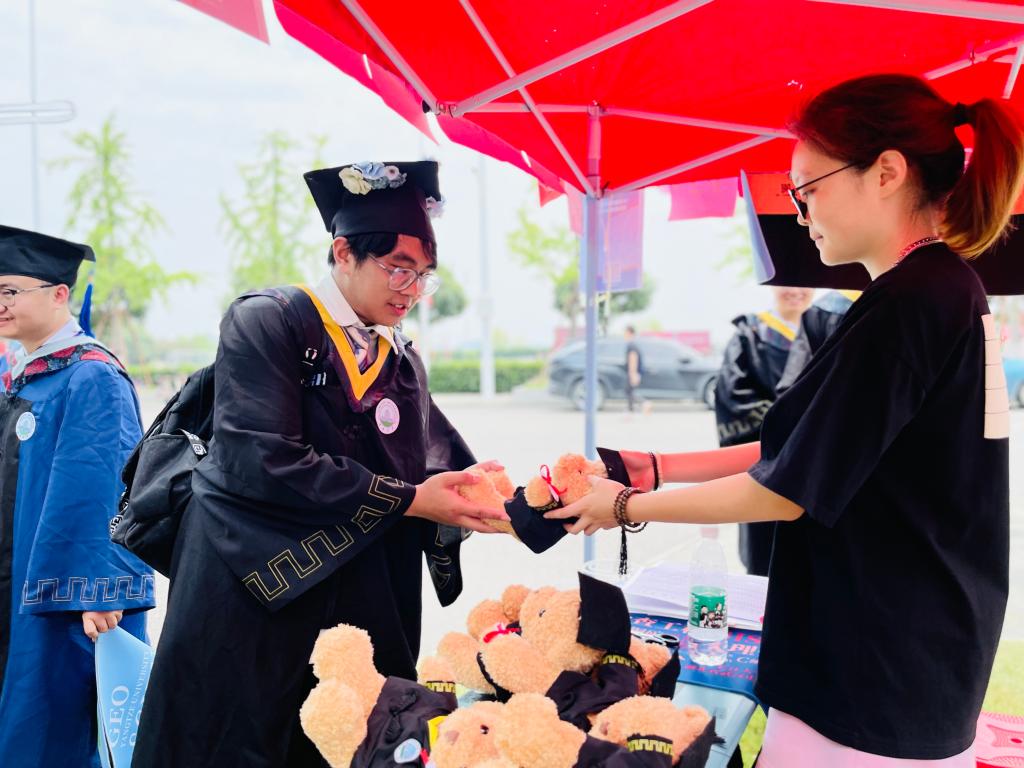会场外,学院精心组织毕业生感恩礼活动,同学们填写问卷,写下对母校的美好祝愿和深情感谢,一个个身着学士袍的小熊玩偶、一张张十大网投正规官网学生原创设计的鼠标垫、印有学院元素的帆布包,寄托着学院对毕业生“前程似锦,一路生花”的殷切期盼。