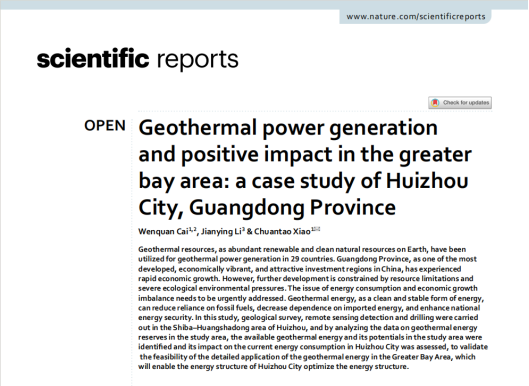 近日,澳门十大网投正规官网平台21级硕士研究生蔡文权在《Scientific Reports》上发表题为“Geothermal power generation and positive impact in the greater bay area: a case study of Huizhou City, Guangdong Province”的研究论文。澳门十大网投正规官网平台为论文第一署名单位,硕士研究生蔡文权为论文第一作者,其导师肖传桃教授为该文通讯作者。