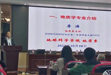 会议首先进行了地质学专业介绍。李涛主任从地质学专业一流的学生、一流的师资、一流的平台、一流的出路、造就一流的专业谈起,从每届地质学专业同学的勤奋学习,踏踏实实,创造了良好学风,取得了丰硕的学习成就,到地质学专业创立以来深厚的积累等,亲切、风趣地讲述了可以“上天、入地、下海”的地质学发展前景,激励同学们在未来努力学习奔赴美好未来。