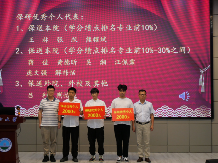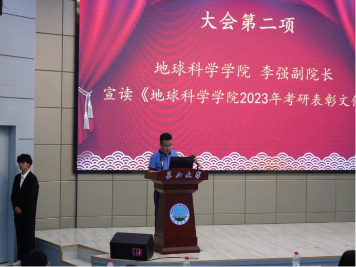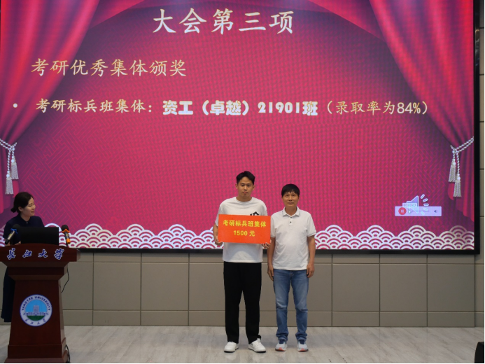 会议在隆重的国歌声中拉开帷幕。副院长李强宣读《澳门十大网投正规官网平台2023年考研表彰文件》,1个考研标兵班级、6个标兵宿舍、2个标兵个人,和43名优秀个人依次上台领奖。