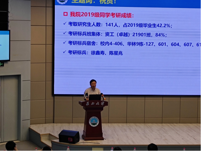 院长胡明毅做总结讲话。他首先对考上硕士研究生的同学们致以最热烈的祝贺,也希望2024届考研同学树立远大目标,坚定信念,勤奋学习,祝愿大家顺利上岸。