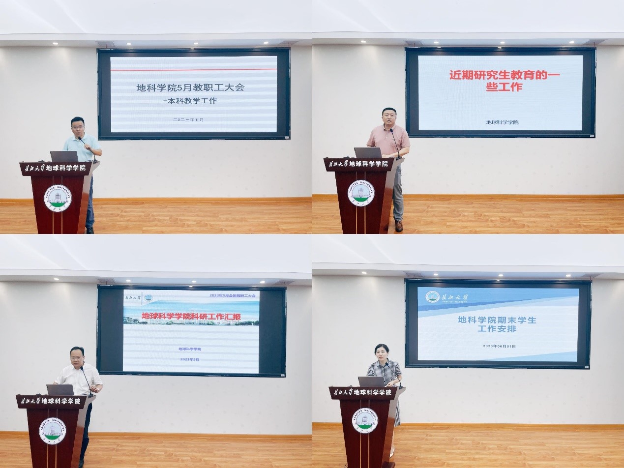 会议伊始,学院领导班子成员就各自分管工作做主题发言。副院长李强围绕教学质量监控、毕业资格审核和2023版本科专业人才培养方案修订进行讲解和安排;副院长吴楠通报学院本年度硕博士答辩情况,安排2024年研招宣传工作,并对研究生培养方面的问题进行了强调;副院长韩登林通报了科研经费到账情况、大型仪器开放预约管理办法实施以来的执行情况,并要求老师积极走出去参加学术会议,扩大学术影响;副院长丁四兵通报了开展校园摩托车专项整治工作的相关事宜;党委副书记冯舒对学生诚信教育、安全教育和毕业生文明离校等方面的工作进行了安排。