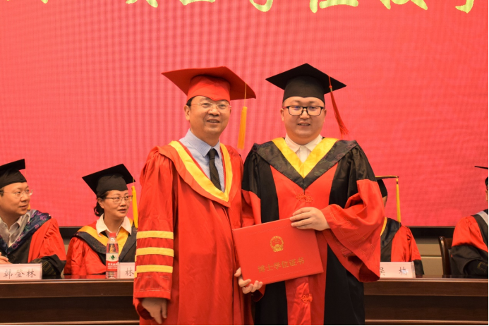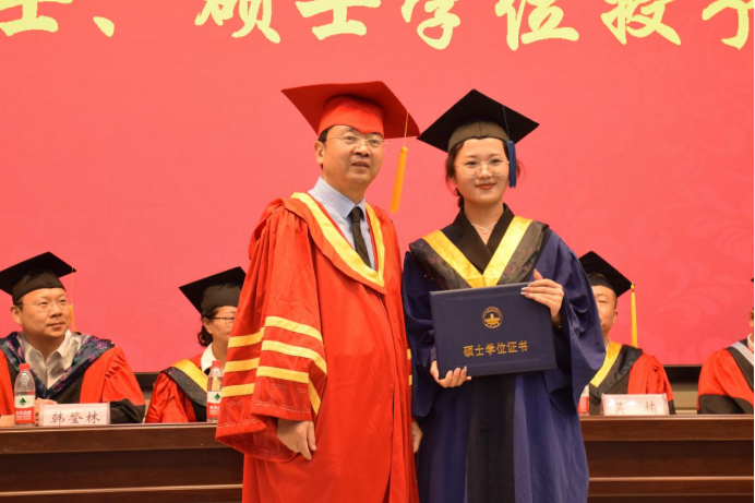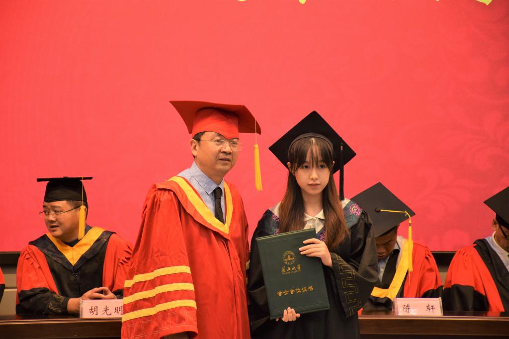 副书记任倩宣读《关于同意授予黎孟琦等270名同学学士学位的决定》,吴楠副院长宣读《关于同意授予张俊龙等105名同学硕士学位的决定》。胡明毅院长为获得学位的同学依次颁发学位证书,援正流苏并合影留念。