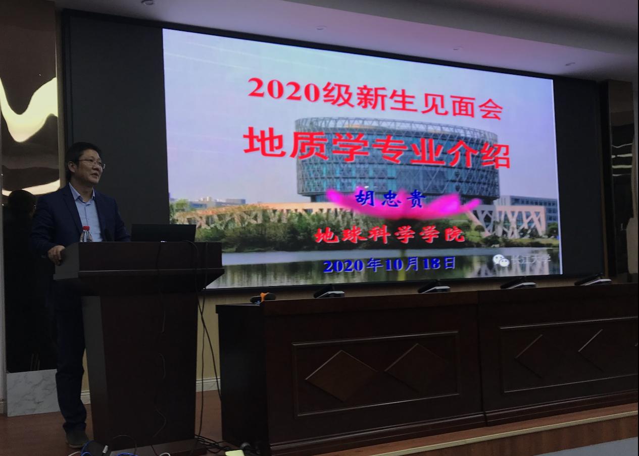 胡忠贵主任介绍了学校、学院及地质系悠久历史,优良传统,重点讲解了我系的学科特点和优势。为了让学生了解地质学专业,从地质学的内涵、研究领域、课程内容、个人发展空间、就业前景等几个方面作了详细地介绍。最后胡忠贵主任希望2020级地质系新生通过与导师的密切联系,助力自己圆满完成学业,早日报效祖国!