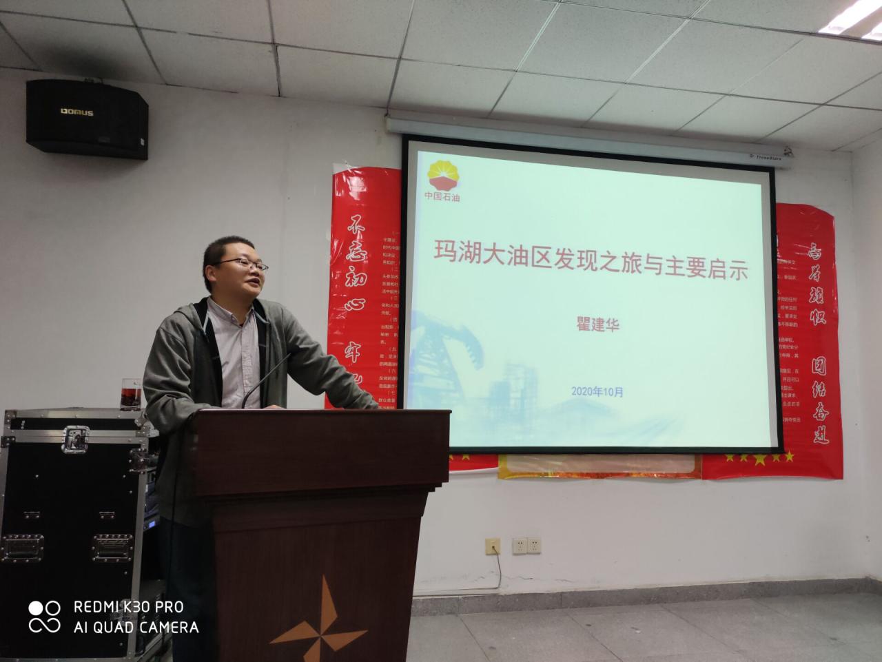 瞿建华以玛湖大油区发现的七大战役为主线,通过“三上斜坡区,新认识新技术带来新突破”、“新老井联动,大面积含油构想初步验证”、“相邻扇拓展,西斜坡百里油区快速落实”、“坚持东斜坡,两翼齐飞喜现又一大场面”、“探索玛中区,中间开花满凹含油显曙光”、“回头看二叠,南部大油区轮廓逐步清晰”和“一体化推进,增储与建产并进渐入佳境”七个故事重现了玛湖大油区发现的全过程。结合多年油气勘探的经历,他提醒学生们在油气勘探过程中应坚守“油气勘探,贵在‘创新’,要在坚持中求变,在变化中坚持。”和“没有解放不了的油气,只有解放不了的思想”的信念。在提问环节,瞿建华针对老师和学生们提出自己问题认真详细地进行了解答,并指出我国中西部油气勘探程度低,为青年学生提供了建功立业的广阔舞台。