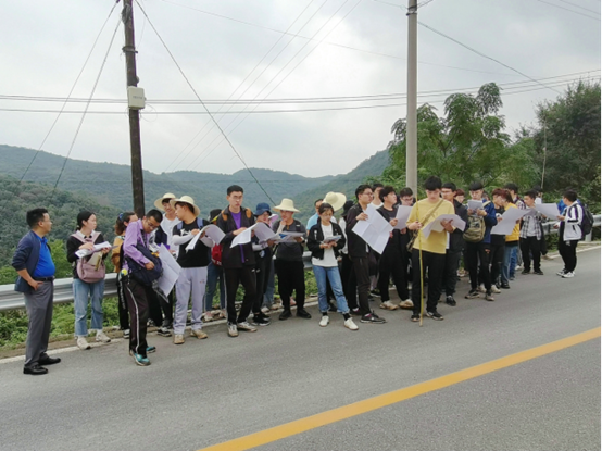 实习期间天公不作美、阴雨连绵,为了保质保量完成实习任务,实习队师生坚持冒雨上山,成了刘家场一道靓丽的风景。