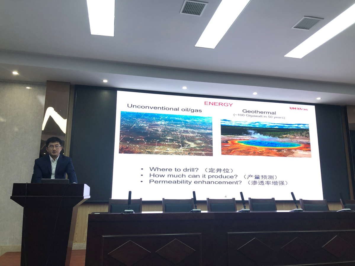 郑教授以全英文的标题 “Characterizing natural fractures in reservoirs and machine learning”引入讲座,从天然裂缝的检测和机器学习方法两个方面进行了讲述。从波段如何衍射、井位如何选取、产量如何预测等方面应用机器学习的方法展开了详细的论述。郑教授全英文的讲座既增加了学生学习专业英语的热情,又丰富了学生的国际视野。郑教授丰富的经历也给师生提供了更多的学术资源。