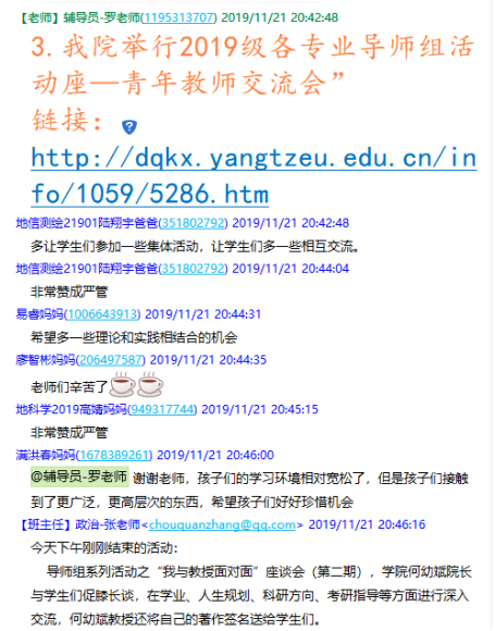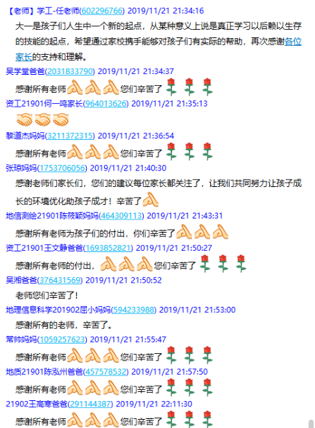 (通讯员罗小玉)11月21日晚19:30,十大网投正规官网在2019级学生家长群召开了19级本科生第一次线上家长会,此次家长会由年级辅导员罗小玉主持,学院党委副书记任倩、辅导员王宁、潘志远、张严、辅导员助理周寒及255名学生家长共同参与了本次线上讨论。