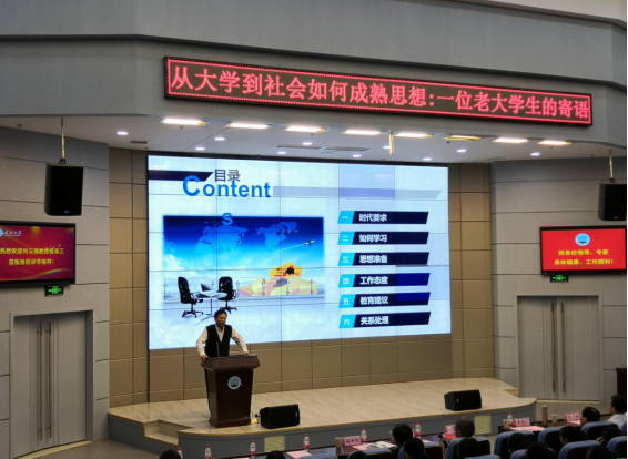 本次讲座的主题为“从大学到社会如何成熟思想”,刘玉强教授以一位老大学生的视角,分别从时代要求、学习方法、思想准备、工作态度、教育建议及事业与生活六个层面为到会师生开展了一场形式活泼、内容深刻的主题教育活动。