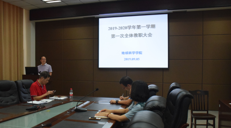 院长何幼斌详细解读了地科学院2019年上半年发展指标完成情况,对存在的问题及原因进行了分析,并提出了下半年工作计划及改进措施,要求老师们在论文、奖励、专利、国家自然科学基金申报工作等方面要提前做好准备。同时要求老师们协调好自身发展和学院发展的关系,力争各方面取得突破。何院长还对近期本科生、研究生各项工作进行部署,指出对目前常规的教学检查、开学补考、资料归档等工作要保质保量完成,不出纰漏;对地质类讲课比赛、大创项目等要积极准备,争取获得更好的名次;对重点工作的“双万工作”、专业介绍和实验室建设方面,更要抓紧时间、积极筹备,争取取得突破性进展。