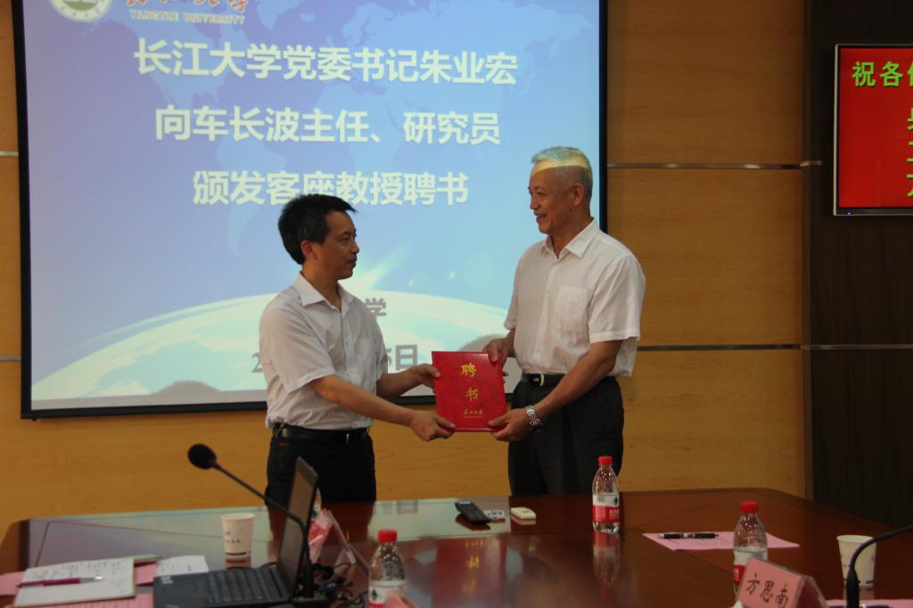 报告会前,车主任在领导和老师们的陪同下参观了武汉校区校园、图书馆、地科学院和沉积模拟实验室,并与党委书记朱业宏书记进行亲切交谈,随后朱书记向车主任颁发了澳门十大网投正规官网平台客座教授聘书。