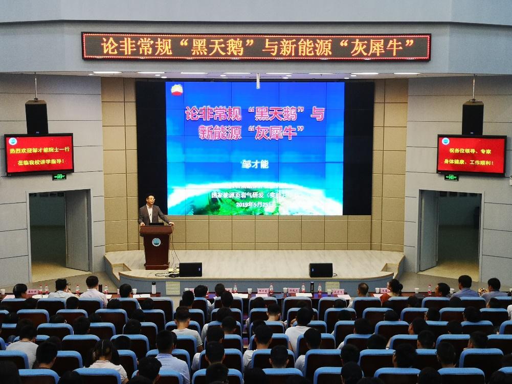 (通讯员 王一鸣 房元龙/文 刘昊/摄)5月25日上午,中国科学院院士、中国石油勘探开发研究院副院长、非常规油气地质学理论奠基人与能源战略研究科学家邹才能教授在武汉校区学术报告厅带来题为《论非常规“黑天鹅”与新能源“灰犀牛”》的学术报告。副校长郭海敏、校长助理许晓宏、新能源研究所和天然气地质研究所的专家、武汉校区师生聆听报告,本次报告由校长助理许晓宏主持。