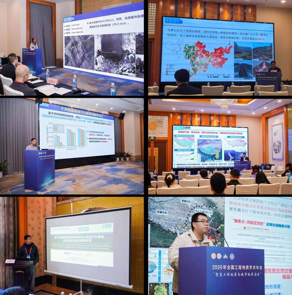 十大网投正规官网温韬、王艳昆、薛阳、张勃成、杨云鹏、赵超共6名教师,硕博士研究生17名、本科生2名参加了此次会议。王艳昆副教授受陈宁生教授委托作了题为“冻胀可能引发2024年1月22日镇雄特大滑坡”的特邀报告。温韬教授在分会场作了题为“基于干湿-冻融循环崩解试验的镇雄-筠连式滑坡成因机制分析”的口头报告。赵超教授在分会场作了题为“基于钻探与物探数据融合的地层结构概率建模研究”的口头报告。张勃成副教授在分会场作了题为“雅砻江上游互层反倾斜坡倾倒变形演化机理与稳定性研究”的口头报告。杨云鹏副教授在分会场作了题为“基于地震动监测的溃决型泥石流堵江灾害链动力机制与临灾预警研究”的口头报告。本科生王芷含同学在研究生分会场作了题为“遥感与人工智能视角下的青藏高原地区滑坡灾害”的口头报告。工程地质中心研究团队报告涵盖了从极微观岩石力学特性到极宏观区域灾害链分析等多个尺度,充分融入智慧工程地质议题,以全新视角对地质灾害孕灾、成灾、致灾机制进行解释,展现了澳门十大网投正规官网平台在工程地质领域,尤其是地质灾害研究领域的综合实力。