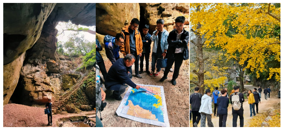 野外阶段先后赴自然资源部海洋-寨底地下河系统、桂林最大地下河-冠岩地下河系统等4个野外试验基地,实地观察描述中生界碳酸盐岩地层岩性特征及岩相古地理、二级三级岩溶地貌特征及微地貌组合形态、不同尺度缝洞系统结构特征、岩溶水循环作用机理、区域走滑断裂分段特征及差异溶蚀规律、白云岩溶蚀机理及缝洞结构、生物礁形态结构及优质储层发育规律等岩溶地质现象。