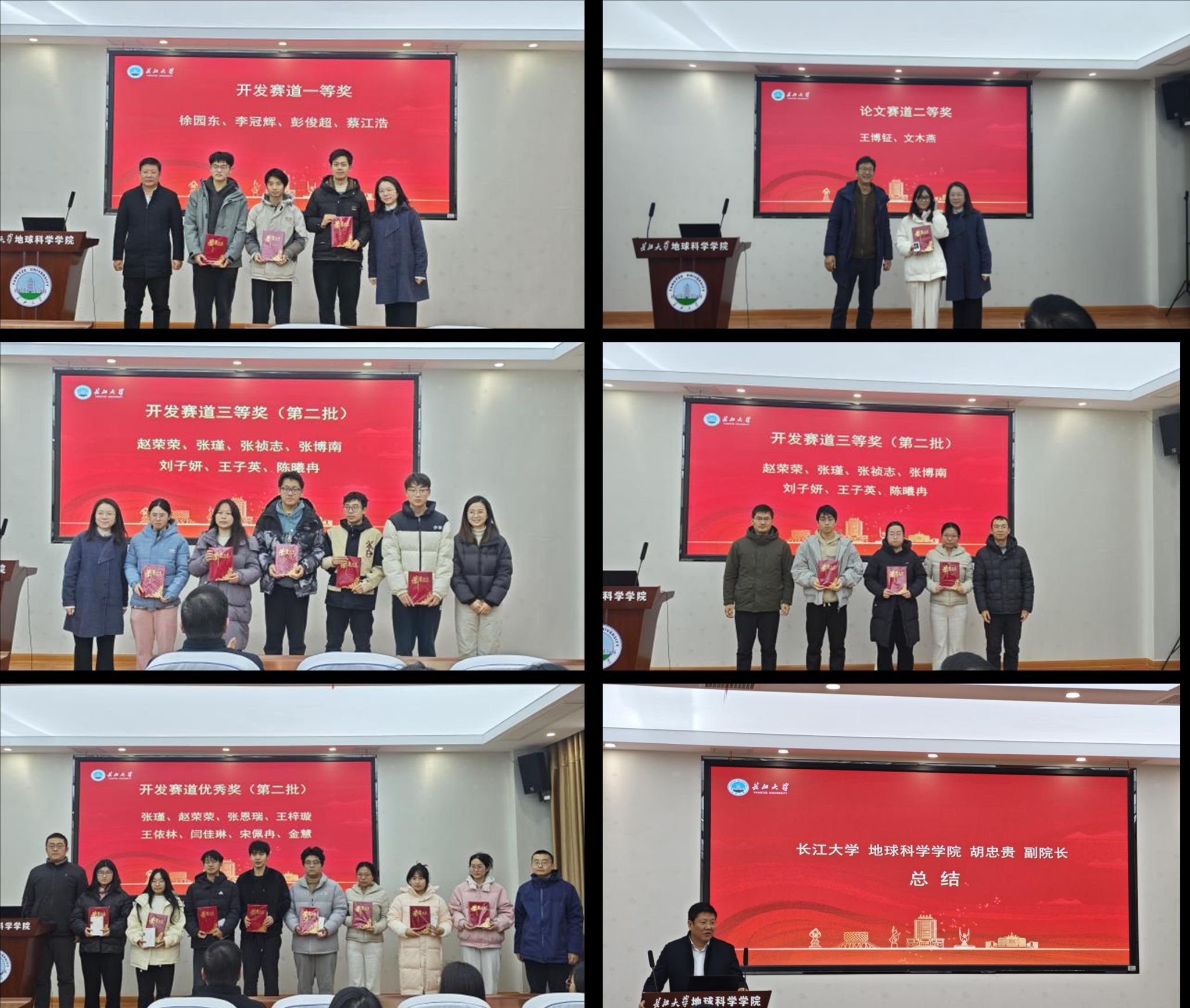 会议伊始,刘远刚主任对本次大赛的丰硕成果进行了总结,对同学们展现出的专业素养给予了高度肯定,并详细介绍了大赛的奖金及奖品设置。随后,颁奖环节正式开始,开发赛道优秀奖、三等奖、一等奖,以及论文赛道二等奖的获奖团队依次上台接受荣誉。颁奖教师与获奖同学合影留念,镜头记录下了他们奋斗后的灿烂笑容。