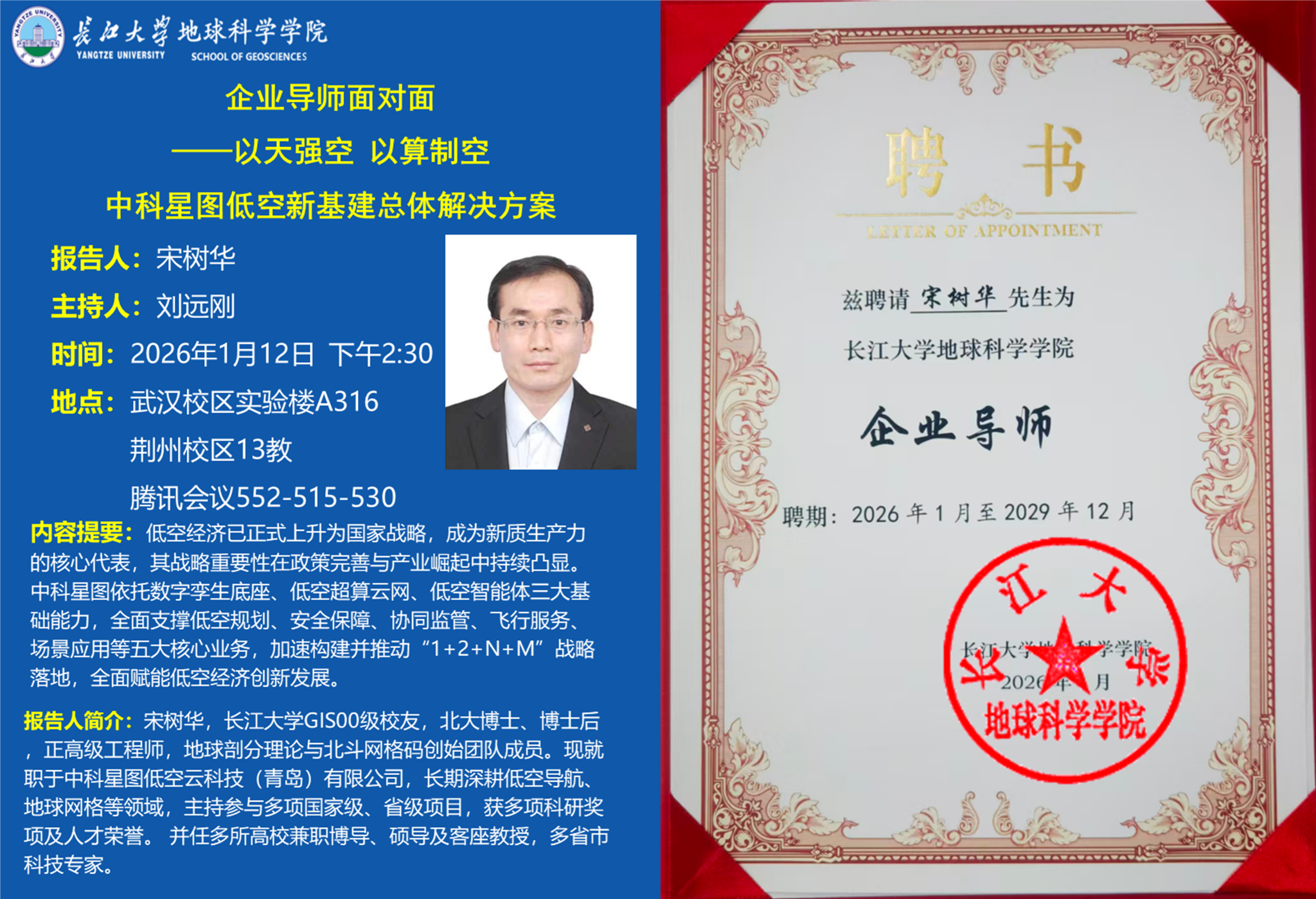 (通讯员:井然)2026年1月12日下午,澳门十大网投正规官网平台“企业导师面对面”活动在武汉校区实验楼A316及荆州校区13教D425线上线下同步举行。本次讲座特别邀请了地信00级校友、中科星图低空云科技(青岛)有限公司技术总师宋树华博士作为主讲嘉宾,为十大网投正规官网师生带来了题为“以天强空 以算制空——中科星图低空新基建总体解决方案”的专题报告。会议由地信系主任刘远刚主持,地科学院100余名师生通过线上线下结合的方式参与了此次交流。