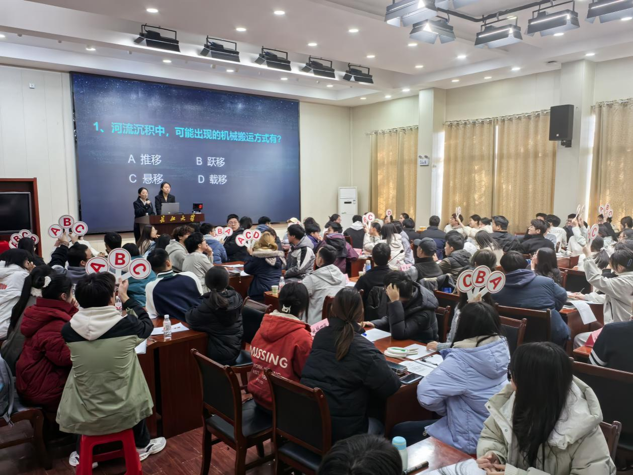 竞赛过程节奏紧凑、气氛热烈,全程精彩纷呈。初赛阶段采用选择题与判断题,全面考察基础地学知识与地质年代专业英语词汇。“河流沉积中,可能出现的机械搬运方式有哪些?”“下列主要由挤压应力引起的有?”等题目接连呈现,各队队员或凝神思考,或低声交流,展现出扎实的基本功与敏捷的反应力,现场始终洋溢着紧张的答题氛围。