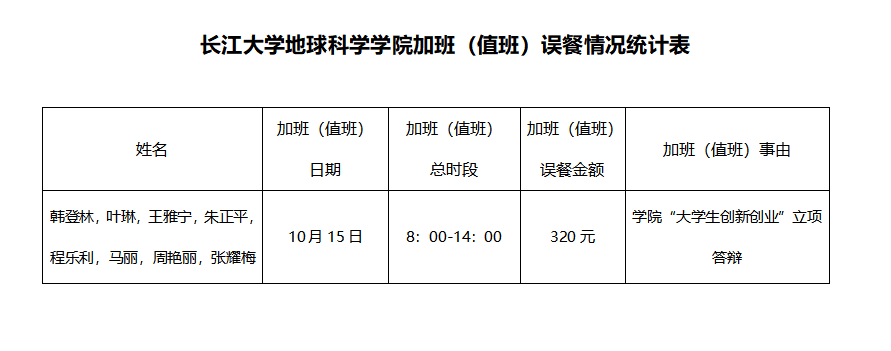根据《澳门十大网投正规官网平台加班(值班)误餐补助管理办法(试行)》(长大校发【2019】83号)文件规定,现对澳门十大网投正规官网平台加班(值班)误餐情况(2020年10月15日)进行公示,如果对加班(值班)误餐情况有异议,可以通过电话或电子邮件等方式向澳门十大网投正规官网平台反映。