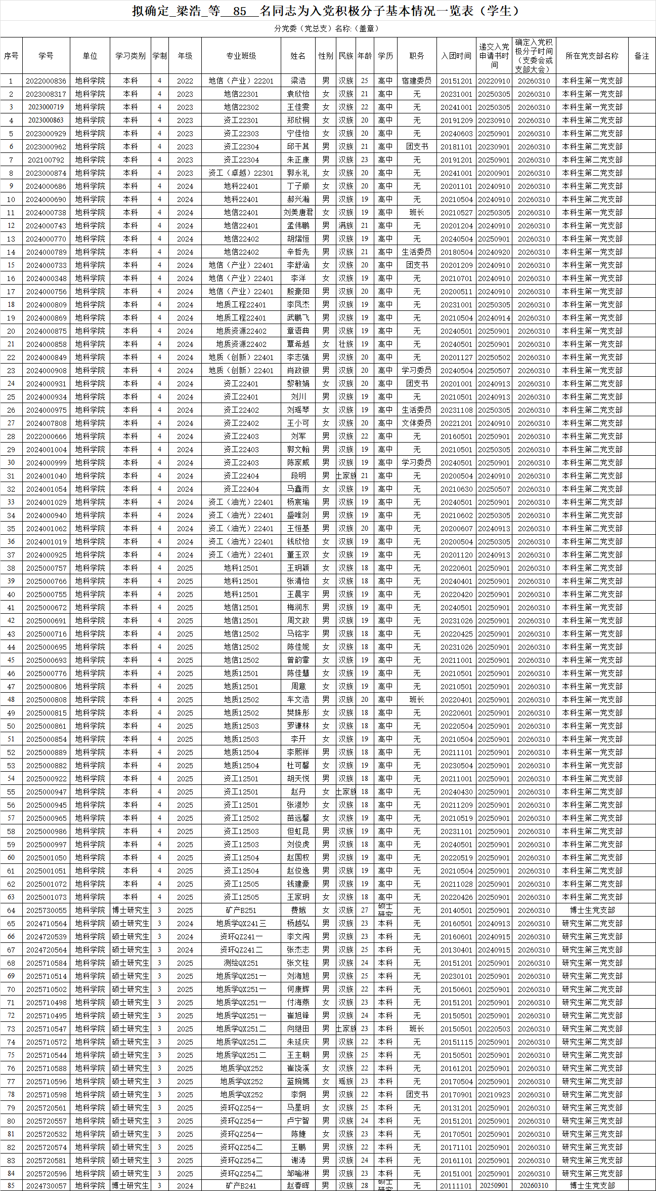 根据党员推荐和团组织推优情况,经支部委员会(不设支部委员会的由支部大会)会议讨论决定并报澳门十大网投正规官网平台党委备案,确定 梁浩 等 85 名同学为入党积极分子,现予以公示。公示时间::2026年3月13日至2026年3月19日(公示时长一般为5个工作日)。