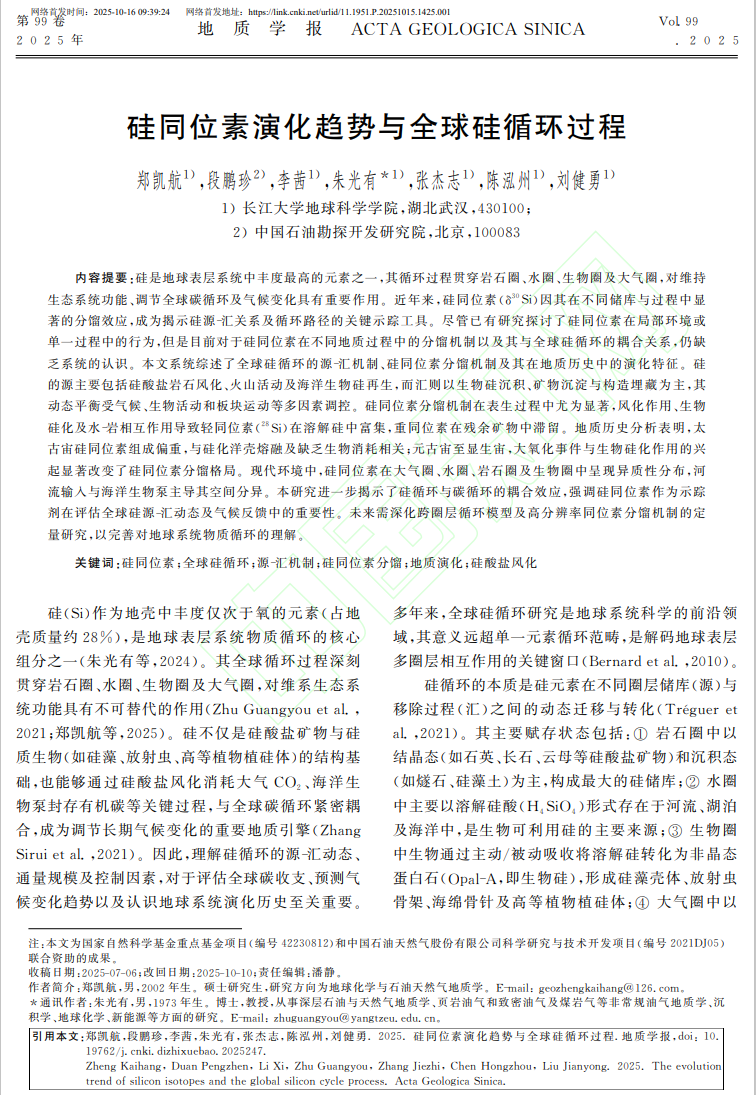近日,地科学院2024级地质学专业硕士生郑凯航以第一作者身份在中文EI检索期刊《地质学报》上发表题为“硅同位素演化趋势与全球硅循环过程”的研究论文(图1)。硕士生郑凯航为论文第一作者,其导师朱光有教授为论文通讯作者,澳门十大网投正规官网平台为第一完成单位。