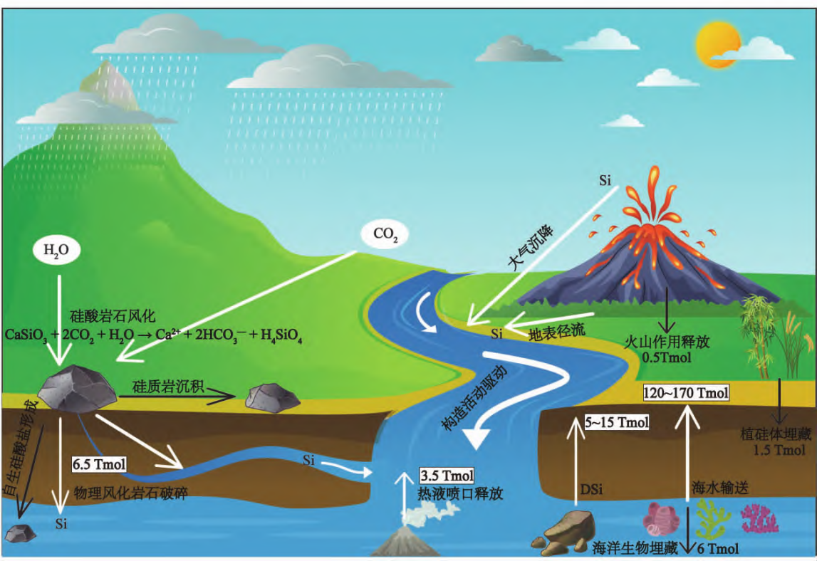 论文系统梳理了硅在地球系统中的循环路径及其对全球气候的深远影响,为理解硅元素在多圈层迁移与碳循环耦合机制提供了全新视角。硅是地壳中含量第二丰富的元素,其循环贯穿岩石圈、水圈、生物圈和大气圈,不仅维持生态系统功能,还在调节全球碳循环与长期气候变化中发挥核心作用。硅的“源”主要包括硅酸盐岩石风化、火山活动和海洋生物硅再生;“汇”则涉及生物硅沉积、矿物沉淀与构造埋藏。这些过程在不同时间尺度上达成动态平衡,并受气候、生物活动与板块构造共同调控(图2)。
