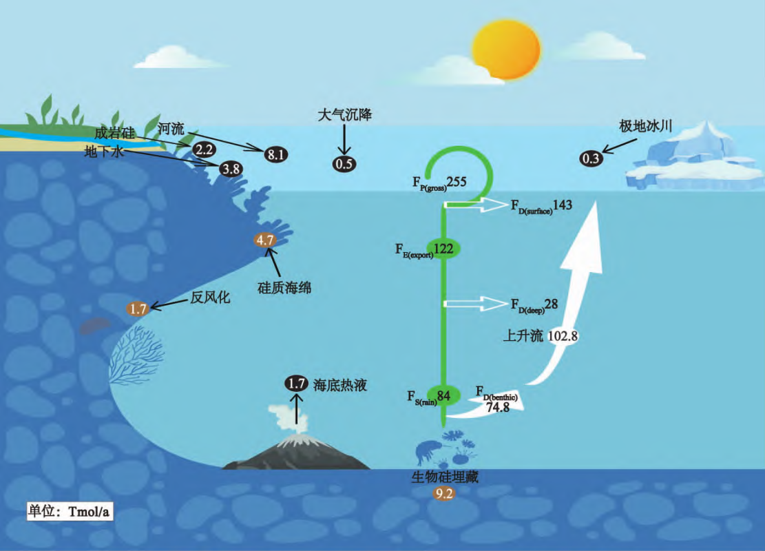 图4 全球海洋硅循环和海洋硅收支示意图