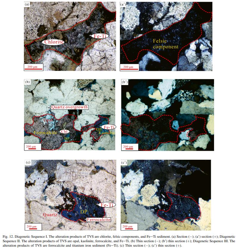 图 2. 成岩序列Ⅰ,火山凝灰质的蚀变产物为铁铝硅酸盐(Fel)、钛铁质沉积物(Fe-Ti)、绿泥石;成岩序列Ⅱ,火山凝灰质的蚀变产物为蛋白石、铁钙质石、高岭石、钛铁质沉积物(Fe-Ti)、绿泥石;成岩序列Ⅲ,火山凝灰质的蚀变产物为铁钙质石和钛铁质沉积物(Fe-Ti)。
