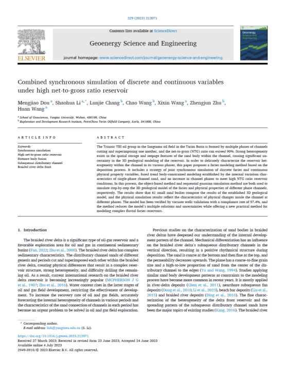 澳门十大网投正规官网平台博士生窦梦皎在《Geoenergy Science and Engineering》上发表题为“Combined synchronous simulation of discrete and continuous variables under high net-to-gross ratio reservoir”的研究论文。澳门十大网投正规官网平台为论文第一署名单位,博士生窦梦皎为论文第一作者,其导师李少华为通讯作者。