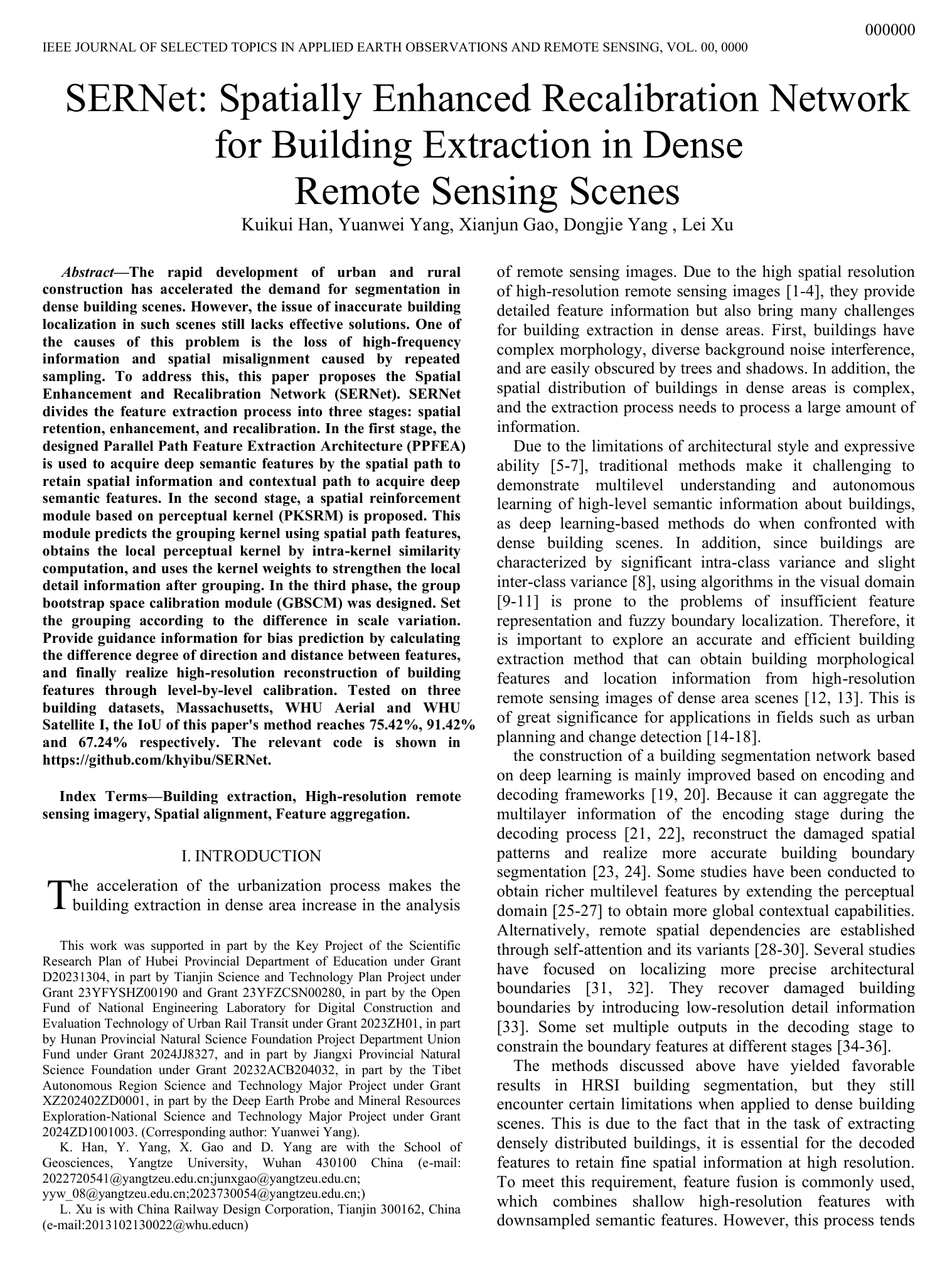 地科学院研究生韩奎奎以第一作者身份在SCI二区期刊《IEEE Journal of Selected Topics in Applied Earth Observations and Remote Sensing》上发表题为“SERNet: Spatially Enhanced Recalibration Network for Building Extraction in Dense Remote Sensing Scenes”的研究论文,其中澳门十大网投正规官网平台为论文第一署名单位,研究生韩奎奎为第一作者,副教授杨元维为论文通讯作者。