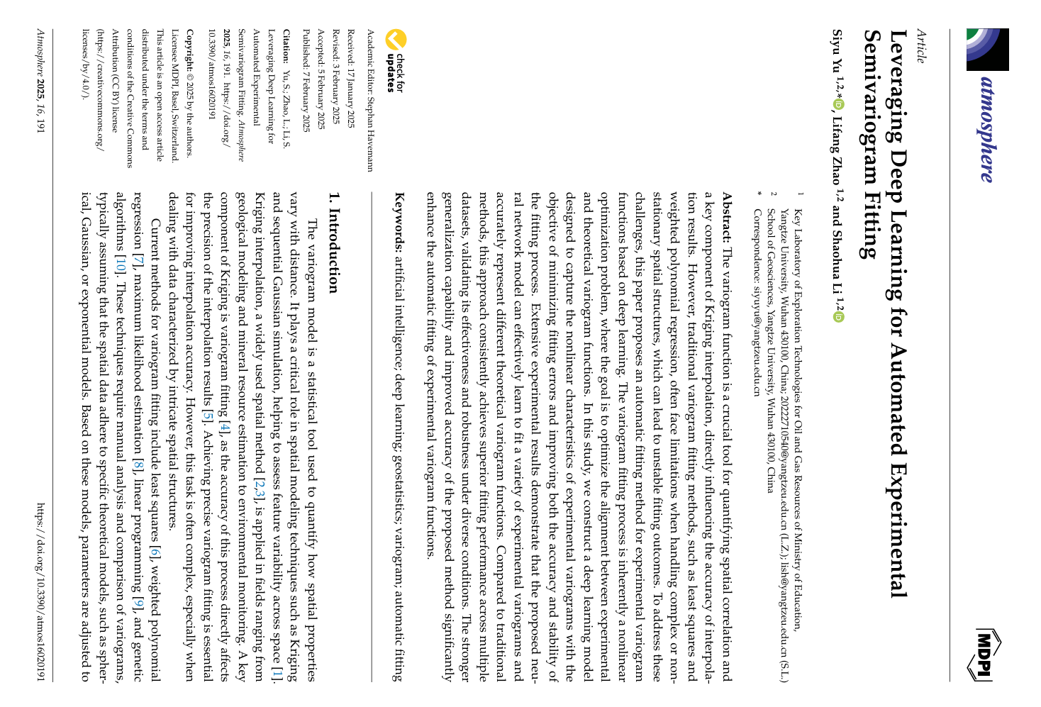 地科学院硕士研究生赵丽芳在《Atmosphere》上发表题为“Leveraging Deep Learning for Automated Experimental Semivariogram Fitting”的论文,澳门十大网投正规官网平台为论文第一署名单位,研究生赵丽芳为第二作者,其导师喻思羽副教授为该论文的第一作者和通讯作者。