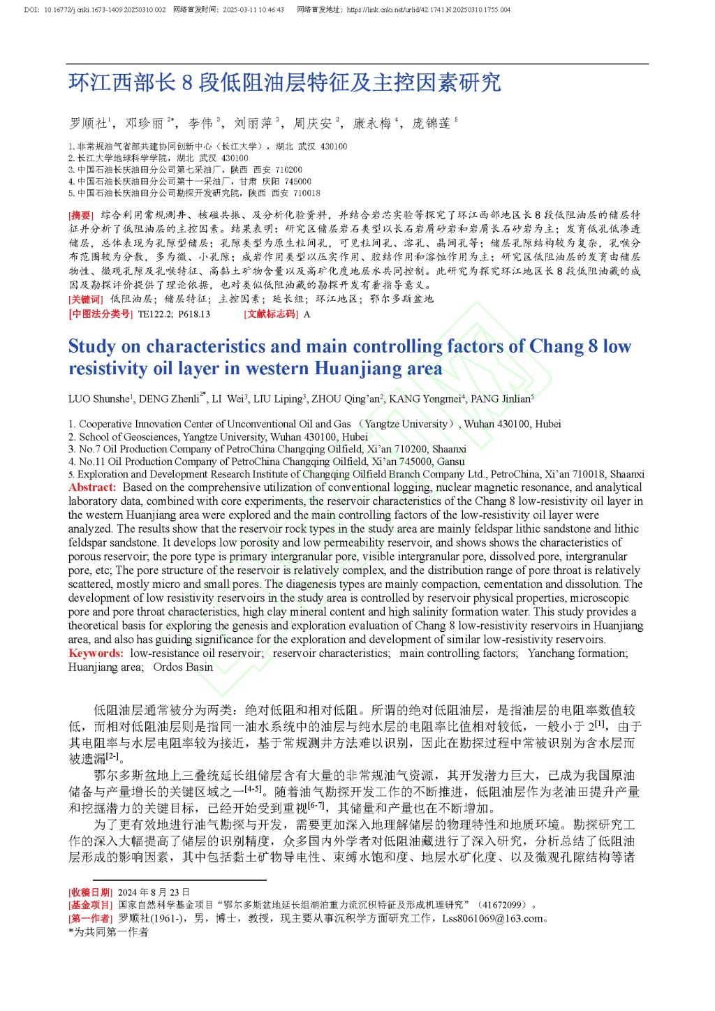 地科学院硕士生邓珍丽在澳门十大网投正规官网平台学报(自然科学版)发表题目为“环江西部长8段低阻油层特征及主控因素研究”的研究论文。澳门十大网投正规官网平台为论文第一署名单位,为论文第一作者,导师罗顺社为第一作者,硕士研究生邓珍丽为论文通讯作者。