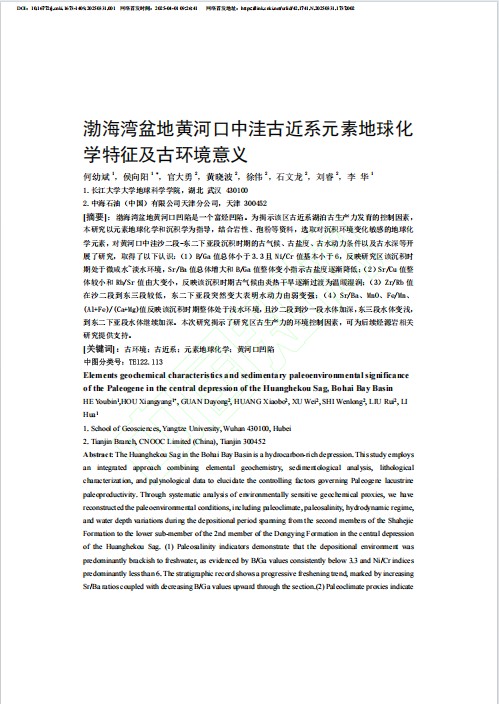 该论文以元素地球化学和沉积学为指导,结合岩性、孢粉等资料,选取对沉积环境变化敏感的地球化学元素,对黄河口中洼沙二段-东二下亚段沉积时期的古气候、古盐度、古水动力条件以及古水深等开展了研究,取得了以下认识:(1)B/Ga值总体小于3.3且Ni/Cr值基本小于6,反映研究区该沉积时期处于微咸水~淡水环境,Sr/Ba值总体增大和B/Ga值整体变小指示古盐度逐渐降低;(2)Sr/Cu值整体较小和Rb/Sr值由大变小,反映该沉积时期古气候由炎热干旱逐渐过渡为温暖湿润;(3)Zr/Rb值在沙二段到东三段较低,东二下亚段突然变大表明水动力由弱变强;(4)Sr/Ba、MnO、Fe/Mn、(Al+Fe)/(Ca+Mg)值反映该沉积时期整体处于浅水环境,且沙二段到沙一段水体加深,东三段水体变浅,到东二下亚段水体继续加深。本研究揭示了研究区古生产力的环境控制因素,可为后续烃源岩相关研究提供支持。