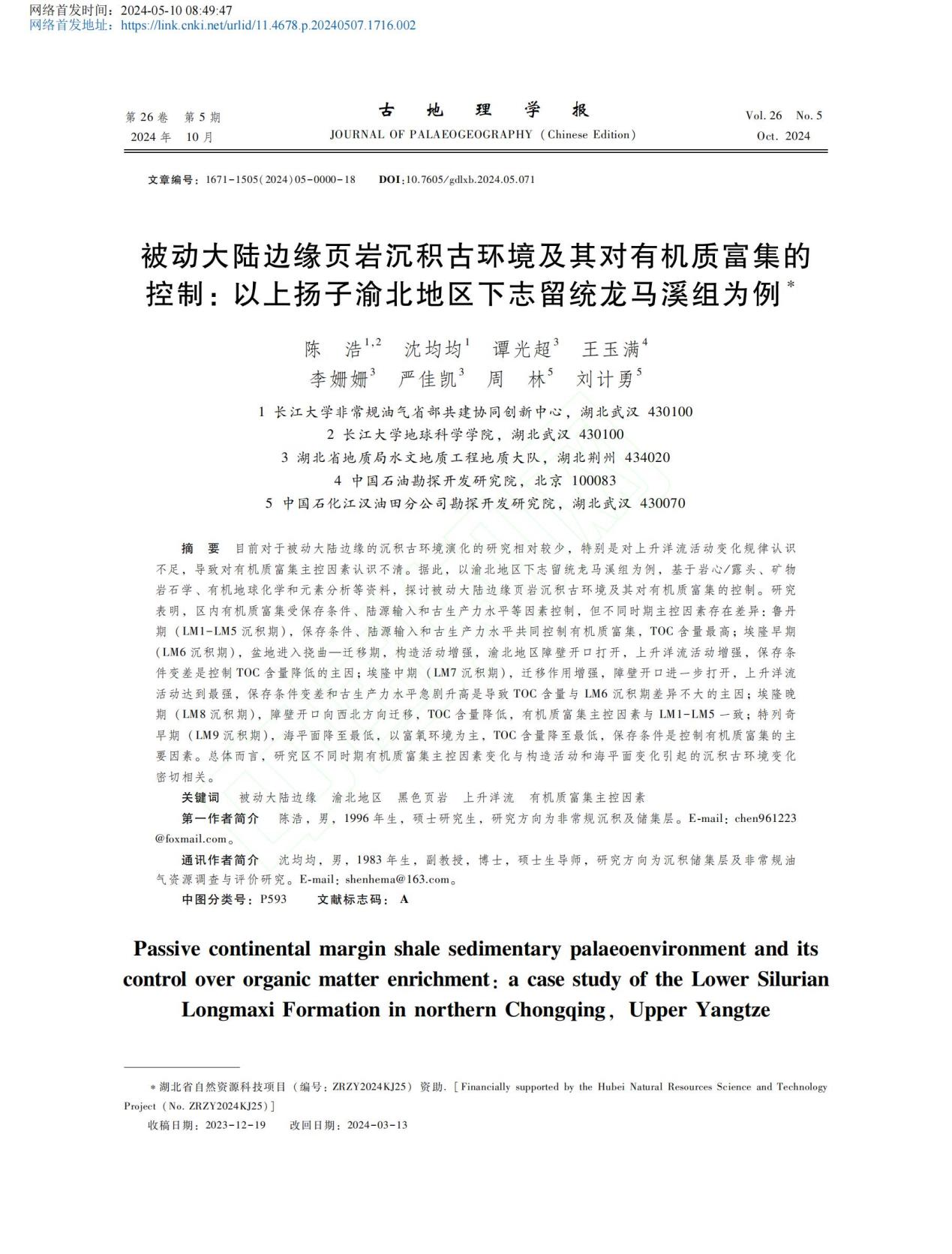 地科学院研究生陈浩以第一作者身份在北大核心期刊《古地理学报》上发表题为“被动大陆边缘页岩沉积古环境及其对有机质富集的控制:以上扬子渝北地区下志留统龙马溪组为例”的研究论文,澳门十大网投正规官网平台非常规油气省部共建协同创新中心和澳门十大网投正规官网平台为论文第一署名单位。副教授沈均均为通讯作者。