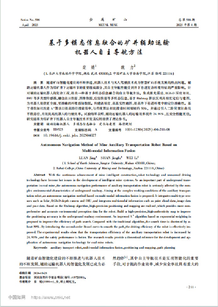 近日,澳门十大网投正规官网平台硕士生栾婧在中文核心期刊《金属矿山》上发表题为“基于多模态信息融合的矿井辅助运输机器人自主导航方法”的研究论文。该论文研究提出了一种基于多模态信息融合的辅助运输机器人自主导航方法,通过结合多种方法,采用改进Rtabmap算法实现高精度定位与建图,优化A*算法提升路径规划效率,为煤矿井工作提供了有效解决方案。澳门十大网投正规官网平台为论文第一署名单位,硕士生栾婧为论文第一作者。