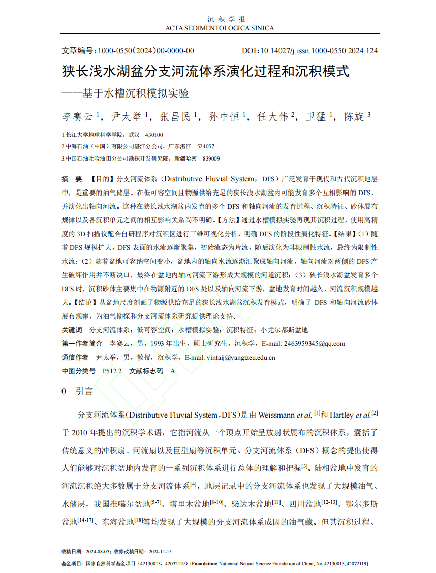 地科学院研究生李赛云在《沉积学报》上发表题为“狭长浅水湖盆分支河流体系演化过程和沉积模式——基于水槽沉积模拟实验”的研究论文。澳门十大网投正规官网平台为论文第一署名单位,研究生李赛云为论文第一作者,其导师尹太举教授为通讯作者。