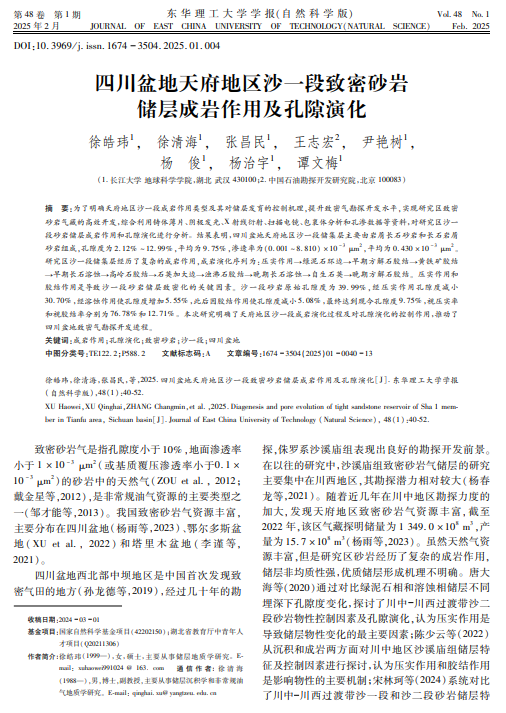 澳门十大网投正规官网平台硕士生徐皓玮在期刊《东华理工大学学报(自然科学版)》上发表题为“四川盆地天府地区沙一段致密砂岩储层成岩作用及孔隙演化”的研究论文。澳门十大网投正规官网平台为论文第一署名单位,徐清海副教授为通讯作者。