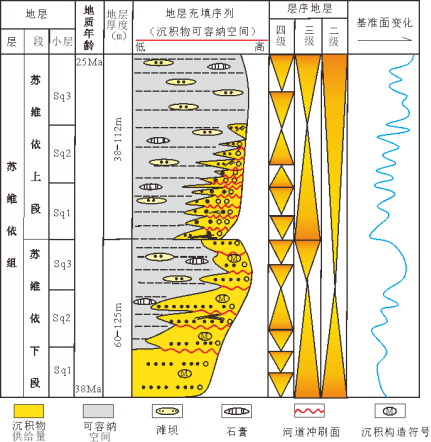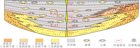 研究结果表明,塔北地区苏维依组发育4大类、17小类岩相类型。其中,苏维依下段沉积时期,研究区南北两侧发育持续退积的季节性浅水辫状河三角洲;苏维依上段沉积时期,研究区北侧发育受多期洪水事件控制、向后退积的季节性浅水曲流河三角洲。通过综合分析,建立了季节性浅水三角洲受可容纳空间动态变化、沉积基准面频繁波动及突发性事件(如洪水)共同影响的剖面及单井沉积模式。